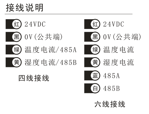 主机完成信号采集、电流变送输出和数据显示功能,主机出来电源和信号接线总共4根线,红黑黄绿。红黑接24V正负,黄为湿度电流,绿为温度电流,电流回路共地回到黑线。如果同时带有485通讯,出线是6根,定义如下图示。